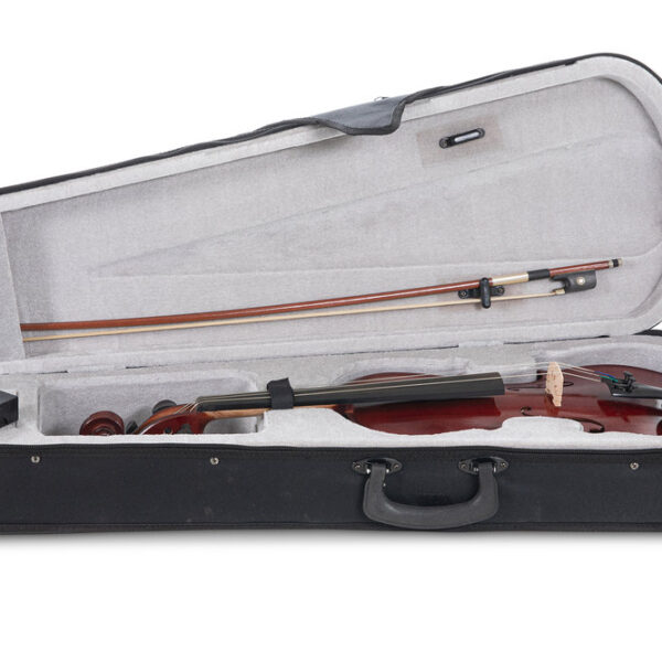 Hardwood fittingsBack and sides solid MapleSolid Spruce topInserted purflingDark red-brown varnishChin restFine tuning tailpieceMassaranduba bow with ebony frogRosinBlack light case